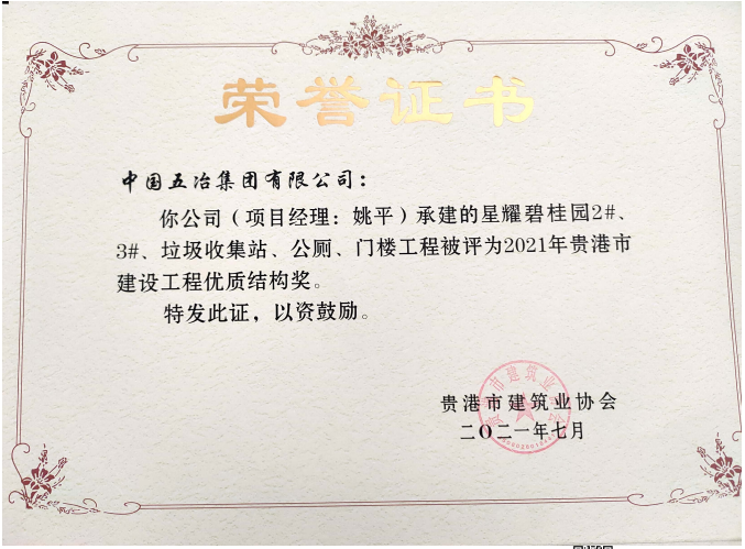 星耀碧桂园5#及地下室工程—2021年贵港市建设工程优质结构奖