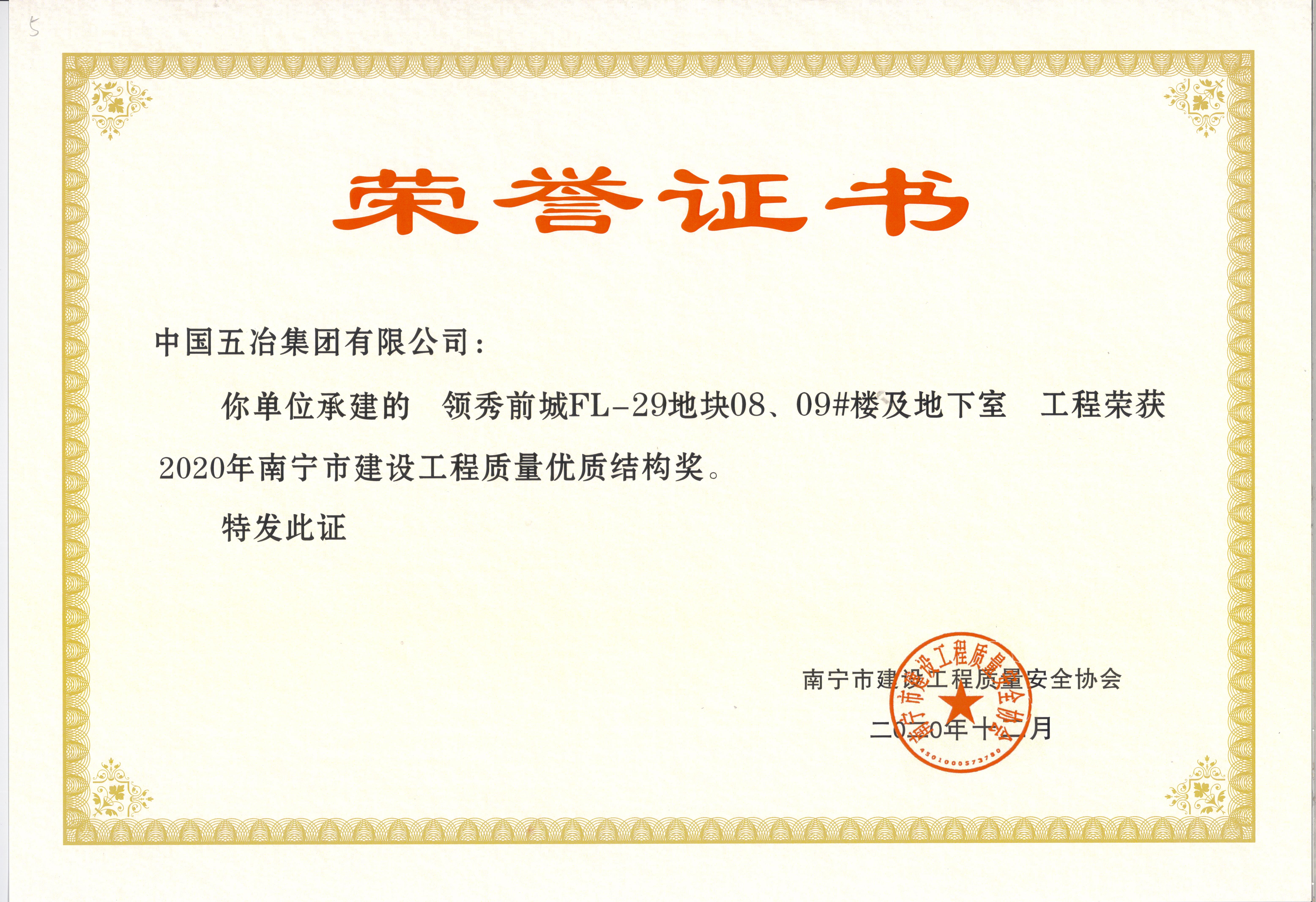 领秀前城FL-29地块08、09#楼及地下室工程—2020年南宁市建设工程质量优质结构奖